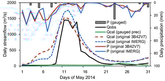 Simulated daily hydrographs in May 2014 using the gauge-based precipitation data, the original 3B42V7 product, and the original IMERG precipitation estimates at Hkamti station. P (gauged) represents the gauge-based, basin-averaged daily precipitation; P (original 3B42V7) and P (original IMERG) represent the original basin-averaged 3B42V7 and IMERG daily precipitation. The other terms in the figure are the same as in Figure 8.