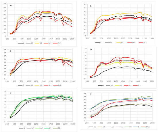 VIS-NIR spectral curves of the horizons of a Red Argisol (A), Yellow Argisol (B), Greyish Argisol (C), Red Cambisol (D), Neosol (E), and Spodosol (F).