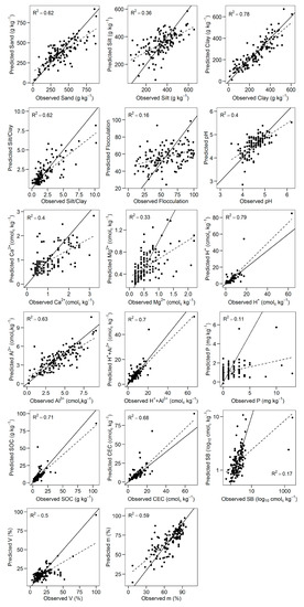 Validation results for observed vs. predicted values for soil chemical and physical properties including: sand content (g·kg−1); silt content (g·kg−1); clay content (g·kg−1); S/C (silt/clay ratio); F (flocculation degree); pH; Ca content (cmolc·kg−1); Mg content (cmolc·kg−1); H content (cmolc·kg−1); Al content (cmolc·kg−1); H+Al content (cmolc·kg−1); P content (cmolc·kg−1); SOC; CEC (cmolc·kg−1); SB (cmolc·kg−1); V (%); m (%). The solid line is the line of regression and the dotted lines is the 1:1 line.