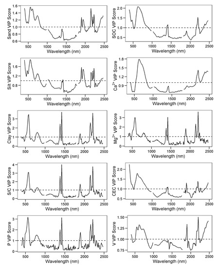 For SOC, the first two regions are broadly related to soil color, primarily to organic matter (humic acids), hematite, and goethite [45]. The VIP score peak at 1400 nm is due to water hydroxyl (–OH) groups that may be adsorbed to soil organic matter. It is possible that clay mineral features (–OH from kaolinite and illite) are acting as a proxy predictor for SOC as was observed by [45]. The VIP peak at 2200 nm appears to be related more to kaolinite/illite Al-OH groups rather than to organic functional groups whereas the spectral region 2350–2470 nm corresponds to spectral absorption features of several organic functional groups [45].