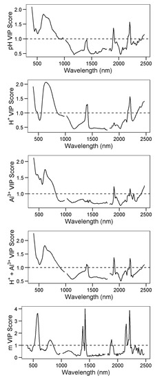 The pH of soil is a result of the organic and inorganic components and this relationship has been demonstrated via spectral modeling before [45]. The VIP graph for base saturation is complex, perhaps showing the influence of sand, clay, and SOC on the model. The graphs for H+Al and Al show a smaller influence from clay mineralogy with the visible region of the spectrum contributing most to the model, likely due to the factors influencing soil color such as SOC and iron oxides.