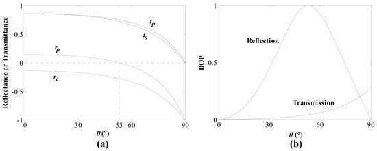 (a) The relation curves between reflection coefficients rs, rp, transmission coefficients ts, tp and incident angle θ; and (b) the relation curves between the DOP of reflected and transmitted light and the incident angle.