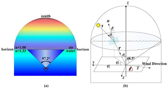 Figure 3b illustrates the geometrical process of refraction under the wavy water surface, where θs is the angle between the incident light and zenith, φs is the incident azimuth angle, and θr and φr denote the refracted zenith angle and azimuth angle, respectively. The vectors s and r represent the incident and outgoing direction, n is normal to the wave facet. β is the angle between n and zenith. The wind direction is opposite to the y-axis. The edge of the Snell’s window is 48.5° to the zenith. Thus, the vectors s and r can be derived with the space geometrical relationship, and as follows.