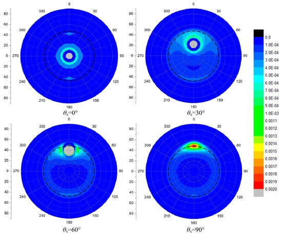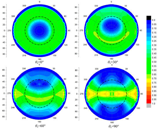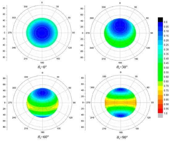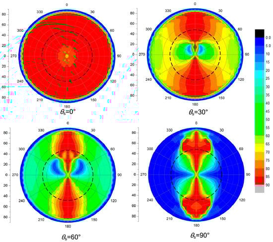 The DOP (degree of polarization) patterns of skylight transmitted through a calm water surface within the Snell’s window at different solar zenith angle θs = 0°, 30°, 60°, 90°, the DOP ranges from 0 to 1.