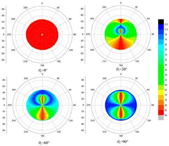 The AOP (angle of polarization) patterns of skylight transmitted through a calm water surface within the Snell’s window at different solar zenith angle θs = 0°, 30°, 60°, 90°, the AOP ranges from 0 to 1, and the reference plane is the meridian of each observation direction.