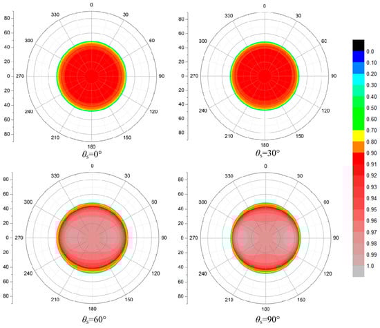 The distributions of transmitted light under the calm surface at different SZAs are shown in Figure 6. We notice that most energy of incident light can pass through the water surface, so the transmitted intensity varies from 0.9 to 1 as a whole, and rises even further with the increasing of SZA. When the SZA is larger (such as 90°) and enhances the resolution of the color bar, we can find a strip of high intensity close to 1 in the direction perpendicular to the sun’s meridian with two bright spots emerging near the Brewster angle. This complies with the two excessively bright areas when observing the whole sky underwater. This is primarily due to the vertical polarized incident skylight with high DOP in that direction when the sun is on the horizon, so the low reflectance leads to the high transmittance. Moreover, the reflectance of incident light near the Brewster angle is lower, so that there are two bright spots [7]. In addition, when light passes through the air–water surface, the n2 law for radiance is applicable and shown as below [4,51].