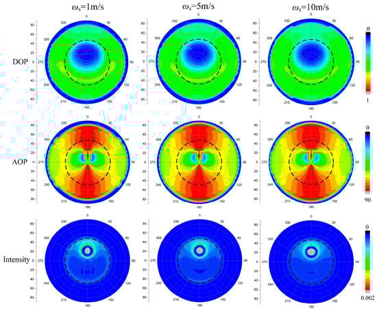 Figure 10 shows the effect of wind speed on the DOP, AOP and intensity patterns of transmitted light under water. We can find that the influence of wind speed (e.g., 1, 5, and 10 m/s) on the patterns of DOP is obvious. The DOP patterns spread slightly to the direction of the wind and the maximum DOP band narrows with the increasing wind speed. The polarization under water also decreases when the surface of the water is undulating, as the sunlight can be refracted in many directions by the waves. Then, there are no more parallel sunbeams underwater, hence there is diminishing polarization of scattered light under the surface. Just as shown in the first row in Figure 10, the DOP decline with the wind speed increasing, as the direct underwater light tends to diffuse due to the wave fluctuation. When the water surface is undulating, the sunlight can be refracted in many directions by the waves. Then, there are no more parallel sunbeams underwater, hence the diminishing polarization of scattered light under the surface. The pattern of AOP is also symmetrical to the sun’s meridian plane just that of AOP. Compared with DOP, however, the AOP patterns are more stable. All these could provide stable orientation information sources for polarization sensing aquatic animals for navigation. However, the effect of wind speed on the intensity distribution under water is significant: the bright ring appears on the edge at low wind speed, but disappears with the increasing wind speed, and the bright circle near the apparent sun position expands. In addition, the edge of the Snell’s window becomes unclear.