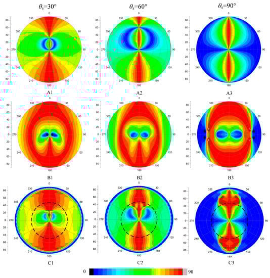 When exploring the transmission light polarization, we start with the polarization and transmission patterns of skylight transmitted through a calm water surface. In this case, the transmission Mueller matrix is related to incident direction only, and the direct solar light has no effect on the polarization distribution of the underwater light field because of their unified incident direction. Thus, we only consider the incident skylight when the surface is flat. The entire celestial hemisphere condensed into Snell’s window with an angular extent of 97°. Outside the Snell’s window, the light from deeper layers is totally reflected and it is dim (under the condition that the substrates are not bright and the scattering constituents of water are normal). Two-dimensional patterns of degree and direction of polarization of refracted skylight are presented for various zenith angles of the sun. The three-dimensional celestial hemisphere (Figure 4) is represented in two dimensions in a polar-coordinate system. The zenith angle and azimuth angle from the solar meridian are measured radially and tangentially. The zenith is at the origin and the horizon corresponds to the outermost circle in this two-dimensional coordinate system.