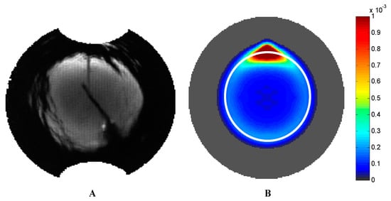 Radiance of downwelling light field. In this and the following figures, the zenith angle for the data increases linearly with the radius from the center. The sun is towards the top of the image and the solar zenith angle is 90°. (A) Data adopted from Bhandari’s work [24]; and (B) simulated results using our model. The white circle indicates the Snell’s cone.