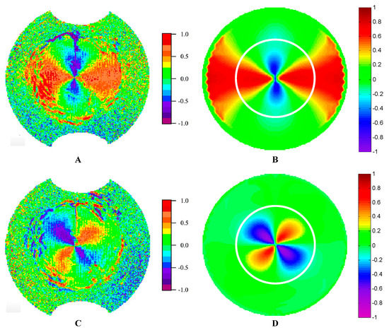 In Figure 13A, we can see that the singular spots of the AOP patterns of skylight are always at the zenith and the sun position no matter where the sun is. The light from the sun’s meridian is always horizontal polarized. The AOP patterns of transmitted light under water resemble that of incident skylight from Figure 13A,C. This is likely that E-vector of the light does not change its phase when refracted by water surface. However, when light transfers from an optically thinner medium to a denser medium, the reflected light comes up with a phase change of π based on the Fresnel’ law. Thus, the reflection changes not only the intensity, but also the phase of incident light, and then the polarization patterns of reflected light are entirely different from that of skylight, as shown in Figure 12B and Figure 13B. We can conclude the polarization characteristics of incident light are reserved in the Snell’s window under water when refraction occurs, especially under calm surface conditions.