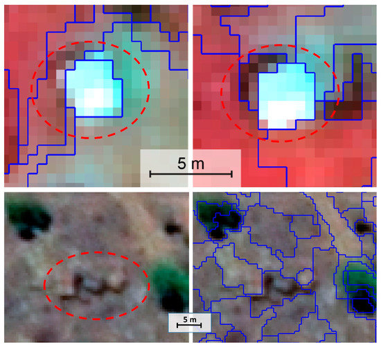 Top: QuickBird 2 subsets of the Yida camp area (acquisition date: 12 October 2012, band combination NIR-R-G (near infrared-red-green)) showing initial image segmentation of two bright dwellings and the cast shadows. Bottom: dark dwellings with very low contrast to the surroundings, where segmentation fails in extracting meaningful objects (Yida camp, 4 March 2013, WorldView-2, R-G-B (red-green-blue)).