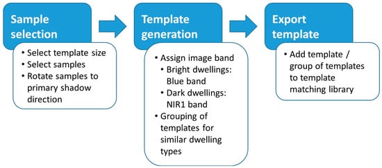 One of the objectives of this work was to create a template library for camp dwellings that can be integrated into existing workflows for dwelling extraction, applicable to different kinds of dwellings. The library is best suited for satellite images with a non-zenith sun position, where the depicted objects cast a shadow depending on their height. The samples for the templates are taken from different camps (Figure 3) to capture the variety of dwelling types at different locations, time slots, and weather conditions such as rainy and dry season or the effects after a sandstorm and different sun azimuth angles. The library is most suitable for resolution levels between 0.5 and 0.6 m GSD, but it also can be scaled to other image resolutions. The applied workflow for creating a template and integration into the library is presented in Figure 4.