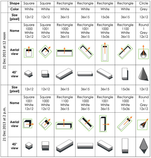 Corresponding to the shadow, objects with a circular layout only require one template, square dwellings require two templates, and dwellings with a rectangular layout require three templates because the shadow can be on one side only, on the short and the long side, or on the long and the short side, which cannot be solved by rotation.