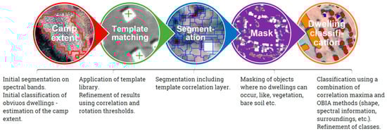 Integrated workflow combining object-based image analysis (OBIA) and template matching for dwelling extraction.