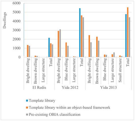 Without a differentiation between dwelling types, the application of the TM approach resulted in the highest number of detected dwellings (2159, for details, see Figure 7), which was expected since TM methods are prone to high numbers of false positives [20]. When integrated into an object-based framework (TMOB approach) the number of classified dwellings reduced to 1542. In comparison to these results, the existing OBIA classification (OB approach) detects 1426 dwellings. When differentiating between dwelling types, the OB and TMOB approaches show similar distributions (Figure 7). Overall, the new TMOB approach detects 116 dwellings more than the pre-existing results in the same area.