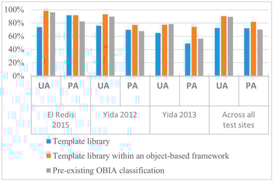 For El Redis, the visual interpretation revealed 657 dwellings within the randomly selected sample areas. Results are shown in Figure 10. TM shows a user’s accuracy (UA) of approximately 74% and a producer’s accuracy (PA) of 92%. TMOB extracted the same number of correctly extracted dwellings (same PA), but the user accuracy increased to approximately 98% based on the reduction of false positives. In comparison, the pre-existing OB already has a very high UA of 96% but a lower PA of 83% compared to the other approaches (Figure 10).
