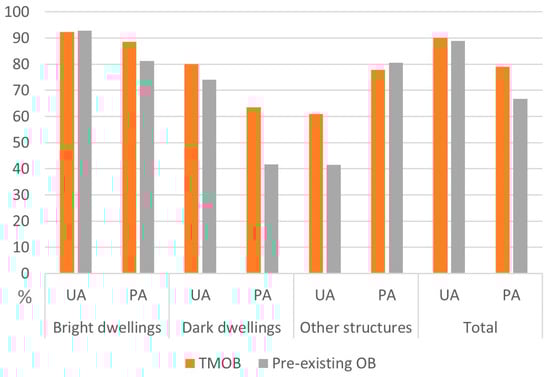 Figure 11 presents the accuracy differentiated by the dwelling type summarized across all test sites; total accuracy values are slightly lower than for the calculation without a differentiation of dwelling types (e.g., blue dwellings recognized as dark dwellings are counted as errors). The figure gives a good impression of how the TMOB approach is especially helpful in improving the detection of additional dark dwellings and other non-bright structures, resulting in a considerably increased PA (by 12.4 percentage points).