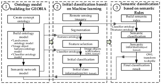 Geographic Object-Based Image Analysis (GEOBIA) techniques have become increasingly popular in remote sensing. GEOBIA has been claimed to represent a paradigm shift in remote sensing interpretation. Still, GEOBIA—similar to other emerging paradigms—lacks formal expressions and objective modelling structures and in particular semantic classification methods using ontologies. This study has put forward an object-based semantic classification method for high resolution satellite imagery using an ontology that aims to fully exploit the advantages of ontology to GEOBIA. A three-step workflow has been introduced: ontology modelling, initial classification based on a data-driven machine learning method, and semantic classification based on knowledge-driven semantic rules. The classification part is based on data-driven machine learning, segmentation, feature selection, sample collection and an initial classification. Then, image objects are re-classified based on the ontological model whereby the semantic relations are expressed in the formal languages OWL and SWRL. The results show that the method with ontology—as compared to the decision tree classification without using the ontology—yielded minor statistical improvements in terms of accuracy for this particular image. However, this framework enhances existing GEOBIA methodologies: ontologies express and organize the whole structure of GEOBIA and allow establishing relations, particularly spatially explicit relations between objects as well as multi-scale/hierarchical relations.