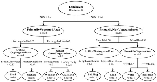 - Classes and class hierarchies were defined. Land cover was defined through the top–down method and was divided into PrimarilyVegetatedArea and PrimarilyNonVegetatedArea. PrimarilyVegetatedArea was divided into ArtificialCropVegetatedArea and NaturalGrowthVegetatedArea. PrimarilyNonVegetatedArea was divided into ArtificialNonVegetatedArea and NaturalNonVegetatedArea. ArtificialCropVegetatedArea is divided into Field and Orchard. NaturalGrowthVegetatedArea is divided into Woodland and Grassland. ArtificialNonVegetatedArea is divided into Building and Road. NaturalNonVegetatedArea is divided into Water and Bare land. The classes are shown in Figure 3. Detailed classes can be defined according to the actual situation.