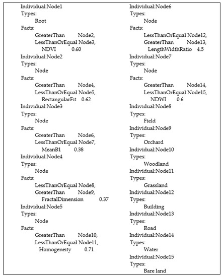 The decision rules for eight types of land-covers are acquired from literatures, priori knowledge and project technical regulations. In general, the decision rules formalized using OWL are as follows:
