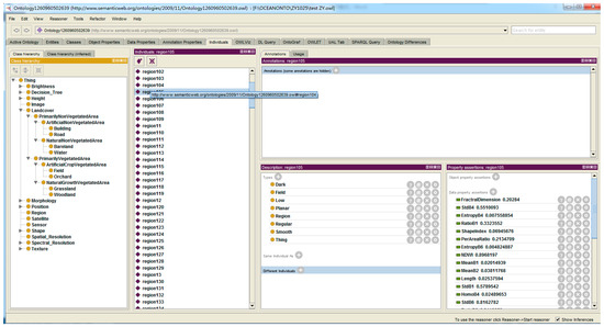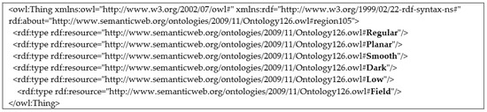 On the basis of the initial classification, each object is reclassified and validated by semantic rules in SWRL to obtain the semantic information. Figure 13 shows a semantic classification result where “the semantic information of ‘region105’ is Regular, Planar, Smooth, Dark, Low, Field”, the expression of all the objects’ classification is the same as “region105”. Thus, the classified objects already exported in OWL format are help for retrieving the object features (Figure 14).