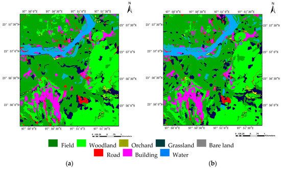 The part of the city selected for the study is characterised by classes identified as Field, Woodland, Grassland, Orchard, Bare land, Road, Building and Water. The eight land-covers are defined based on the Geographical Conditions Census project in China [32], which are described as follows: Field is often cultivated for planting crops, which includes cooked field, new developed field and grass crop rotation land. It is mainly for planting crops, and there are scattered fruit trees, mulberry trees or others. Woodland is covered by natural forest, secondary forest and plantation, which includes trees, bushes, bamboo, etc. Grassland is covered by herbaceous plants, which includes shrub grassland, pastures, sparse grassland, etc. Orchard is artificially cultivated for perennial woody and herbaceous crops. It is mainly used for collecting fruits, leaves, roots, stems, etc. It also includes various trees, bushes, tropical crops and fruit nursery, etc. Bare land is a variety of natural exposed surface (forest coverage is less than 10%). Road is covered by rail and trackless road surface, including railways, highways, urban roads and rural roads. Building includes contiguous building areas and individual buildings in urban and rural areas. Water includes all types of surface water.
