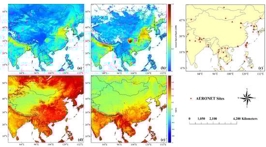 AERONET, which provides continuous, cloud-screened, and quality assured observations of spectral AOD, is a global network of calibrated sun photometers [36,37]. The AERONET AOD level 2.0 datasets, obtained from [38], are provided from spectral bands centred on 0.34, 0.38, 0.44, 0.50, 0.675, 0.87, and 1.02 µm, at 15 min temporal resolution and assured low uncertainty [39]. For validating the recovered results, this study used 56 AERONET sites in the geographical areas defined above from 2013 to 2015, which is illustrated in Figure 1c. Moreover, AERONET does not acquire AOD at 0.55 µm, so AOD values at 0.55 µm were interpolated by the AOD values at 0.44 and 0.87 µm based on the Ångström exponent for the 0.44–0.87 µm wavelength pair [40].