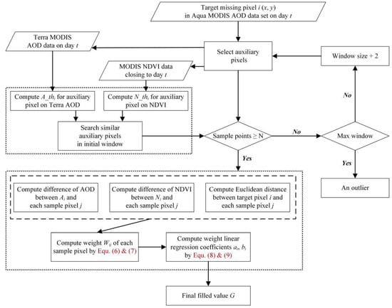 where and are the average of all similar pixels in the selection window in the primary and auxiliary AOD datasets, respectively. The complete flowchart of the NDVI-based WLR AOD recovery method is illustrated in Figure 2.