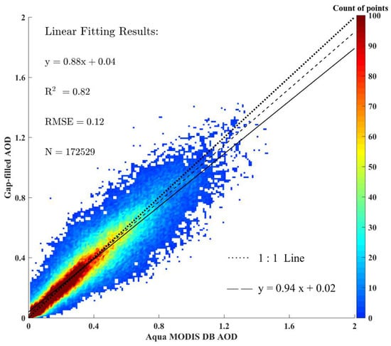 Figure 4 shows the scatterplot of the relationships between the original Aqua AOD (actual value) and the gap-filled AOD (recovered value), where the colour bar represents the density of points. The total fitting pixel pairs reached 172,529, while it should be noted that only the simulated missing pixels participated in the calculation. The fitting results demonstrated that the fitted line was close to the 1:1 line with the decision coefficient, R2, reaching 0.82 and the root mean square error (RMSE) was as low as 0.12. In general, the gap-filled AOD tended to overestimate when the original AOD was lower than 0.3 and tended to underestimate when the original AOD was higher than 0.4, according to the linear fitting equation. In order to avoid the influence of high AOD pairs to the slope and intercept of the linear fit, the dashed line is linearly fitted under the condition that the AOD is smaller than 0.7. As a result, the slope increases from 0.88 to 0.94 which is closer to 1, while the intercept decreases from 0.04 to 0.02 which is closer to 0. Therefore, it is proven that the performance of recovery will be affected by large AOD, which tends to be underestimated.