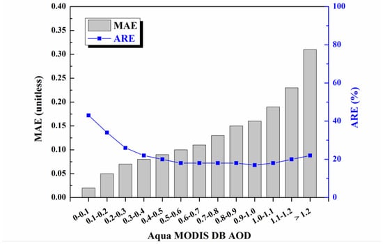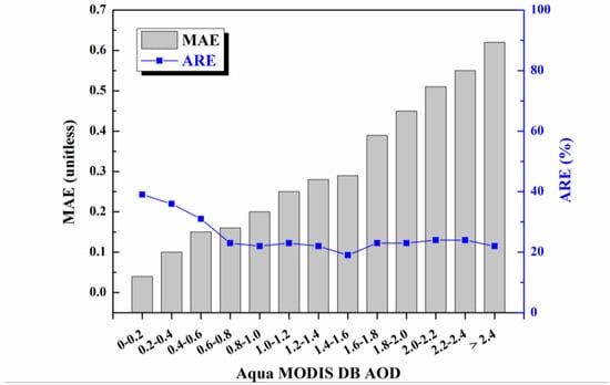 The lower MAE and ARE indicate a better performance of AOD recovery. As shown in Figure 5, although the MAE increased with the increase of the original AOD, the ARE maintained a value of approximately 20% when the original AOD was beyond 0.4. This result is in agreement with the hypothesis of a linear relationship between the multi-temporal AOD, because the absolute error would proportionately increase along with the growth of the original AOD.