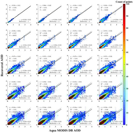 Scatterplots between the original Aqua AOD and recovered AOD are illustrated in Figure 6, where these twenty scatterplots sequentially correspond to the window mask half width ranging from 1 to 20. The colour bar displays the density of points and the lines represent the results of linear fitting. Along with the increase in the simulated window mask, the slope of the linear fitting equation decreased from 0.92 to 0.83, the intercept of the linear fitting equation increased from 0.01 to 0.05, and the linear regression R2 declined from 0.92 to 0.80. It can be concluded that when the window mask was smallest, the optimal recovery performances were achieved, and the effectiveness of recovery decreased as the window mask became larger. When the half width of the window mask was 1, the fitting line was closest to the 1:1 actual line, with the decision coefficient of the linear regression R2 reaching 0.92. While the half width of the window mask was 20, the decision coefficient R2 of linear fitting was still over 0.8. In addition, it should not be ignored that there was an obvious underestimation when original AOD value was relatively high, no matter the size of the window designed. In order to eliminate the effect of high AOD pairs to the slope and intercept of the linear fit, the linear fitting under the condition that the AOD is smaller than 0.7 has been conducted in each sub-figure via dashed line. As a result, the slope increases to be closer to 1 and the intercept decreases to be closer to 0, which indicates that the performance of recovery will be affected by a large AOD in each size of the cloud mask. It indicated that the extent of underestimation was aggravated as the window mask and AOD range became larger. From a practical perspective, this type of underestimation in Beijing might cause a negative bias in overall aerosol assessments. Nevertheless, it was meaningful that if there had been approximately 400 km 400 km missing data from the Aqua AOD caused by a mono-temporal cloud obscuration, over 80% of the recovered AOD by NWLR using Terra AOD was consistent with the real AOD.