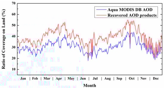 The averaged ratio of pixels with valid AOD on land for the original Aqua MODIS DB AOD datasets and the recovered AOD products from 2013 to 2015.