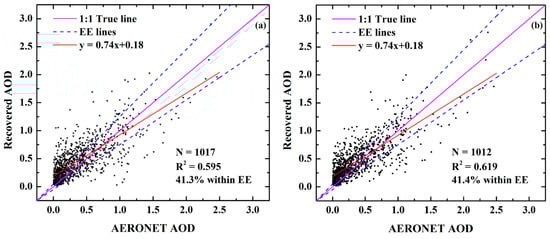 Scatterplot of the recovered AOD against AERONET AOD in the situation that missing AOD in Aqua MODIS DB datasets were recovered by Terra MODIS DB AOD datasets while the corresponding AERONET site acquired validated AOD in whole South and East Asia from 2013 to 2015. (a) The ground AERONET site corresponds to the nearest AOD gridded pixel; (b) the ground AERONET site corresponds to the aggregation of 3 × 3 pixels. The purple solid line represents the 1:1 reference line; the blue dotted lines represent the expected error (EE) lines; the red line is the linear regression result.