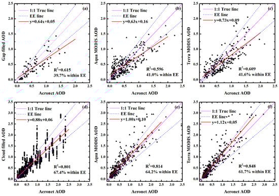 Scatterplots of AERONET AOD against recovered AOD, original Aqua MODIS AOD, and referenced Terra MODIS AOD, in South Asia (a–c) and Beijing (d–f), respectively. Particularly in (d), one AERONET AOD corresponds to a set of cloud filled AOD in different cloud dimensions. The purple solid line represents the 1:1 reference line; the blue dotted lines represent the expected error (EE) lines; the red line is the linear regression result.