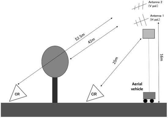 where δ is cross-talk, f is the channel imbalance, S represents a scattering matrix for a target, and M represents an observed scattering matrix. Observation error caused by our GB-radar system is assumed to be represented by δ and f. δ and f were obtained for each experiment. The head of the aerial vehicle, where the antenna system was deployed, was rotated for the second experiment to observe the CR and forest separately. However, the alignment of the antenna was maintained during the experiment to avoid the change of δ and f.