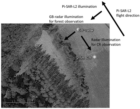 In the second experiment, forest observation was performed for 18 h using GB-radar. Then, the antenna was rotated to observe the 2.5-m triangular trihedral CR, which was deployed on a vacant piece of land (Figure 3). After the measurement, the 2.5-m CR was rotated to the north-east direction for Pi-SAR-L2 observation; Pi-SAR-L2 observed the area in the same configuration (incident angle and observation direction).
