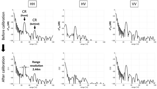 GB-radar range profiles before and after calibration for the first experiment are presented in Figure 5. The range profile at less than 20 m is affected by direct coupling between the antenna and its surroundings. In the case of HH and VV polarization observation, the peak of the direct coupling is observed at 0 m. On the other hand, in the case of HV and VH polarization observation, the peak of the direct coupling is located at half the distance between then, and is observed at 2.7 m. A signal from the CR in front of the tree is observed at 27 m in the range profile. A signal from the CR behind the tree is observed at 53 m, and is not observed by the GB-lidar that is deployed on the aerial vehicle. The signal from the CR deployed in front of the tree is observed in HV polarization before calibration; this result indicates higher cross-talk. The signal in HV polarization is suppressed after calibration. The cross-talk and channel imbalance are improved from −13.3 dB to −30.7 dB, and from 1.06 to 1.00, respectively. Worse cross-talk values were observed in the second experiment. Cross-talk and channel imbalance were improved from −14.8 dB to −33.5 dB, and from 0.66 to 1.07, respectively, after calibration. The lower cross talk and channel imbalance of ~1 after calibration indicate that the assumption that our GB-radar system is represented by δ and f (Equation (1)) is valid. The values are comparable to the cross-talk value of −31.7 dB and the channel imbalance of 1.013 that were obtained with PALSAR [7].
