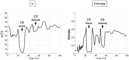 The range profiles for α and H obtained in the first experiment are shown in Figure 6. α is approximately 0° for the CR in front of the tree. This value indicates surface scattering, and results are consistent with theory. α is approximately 50° for the CR behind the tree, which is a similar value as the surrounding tree canopy. On the other hand, H is approximately 0 for both CRs. The radar signal from the CR behind the tree travels through the tree canopy, which may increase the α value, similar to radar reflection from the tree canopy. However, this situation does not significantly affect the H value. The characteristics of the signals from the CRs are summarized in Table 5.