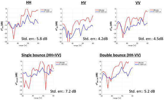 Range profiles of various σ0 values obtained from GB-radar (red) and Pi-SAR-L2 (blue).