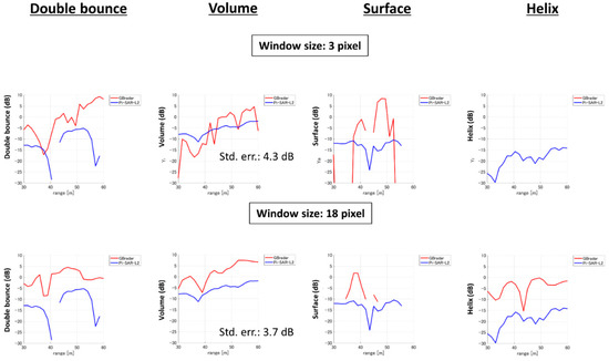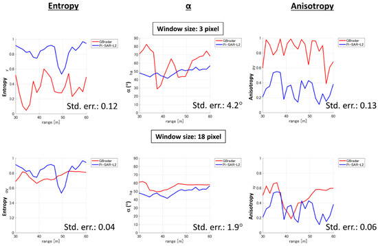 The range profiles of H/α/anisotropy are presented in Figure 8 at window sizes of 3 pixels and 18 pixels. The GB-radar profile with a window size of 3 pixels does not match that derived from Pi-SAR-2 data. On the other hand, the GB-radar profile with a window size of 18 pixels matches the Pi-SAR-2 profile well, and the standard deviation is reduced to less than half. The independence of the radar signal for each pixel is worse for the GB-radar case, because of its worse range resolution of 2.44 m. This situation may induce a systematically lower entropy value, and affect the other two parameters. The increase in the window size increases the entropy, and may cover the worse range resolution.