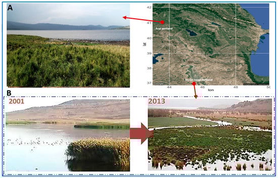 Location of the two case studies: (A) Lake Arpi in Armenia in August 2014; (B) The Dorge Sangi wetland in Iran; the two photos represent the condition of the study area in the spring time of the years 2001 and 2013.