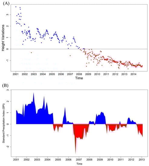 Urmia Lake height variation (in meters) for years 2001–2014 based on satellite radar altimetry data (A); Standard Precipitation Index (SPI) for Dorge Sangi during, years 2001–2013, based on measurements from Naghadeh, which is the nearest weather station to Dorge Sangi (B).