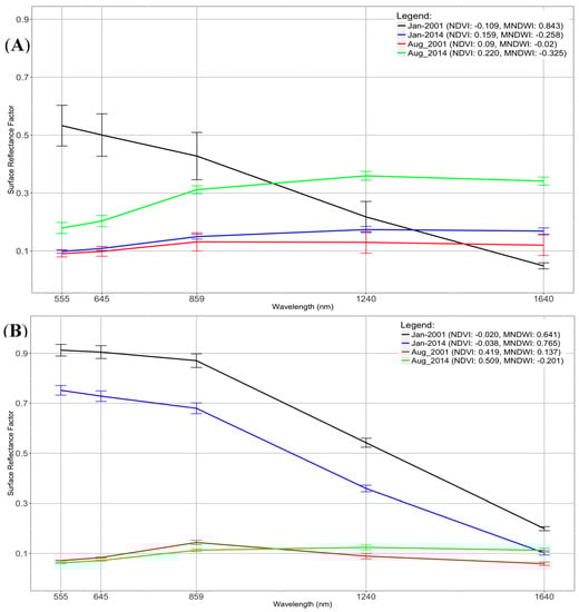 Mean spectra in Dorge Sangi wetland (A) and Arpi wetland (B) from Moderate-Resolution Imaging Spectroradiometer (MODIS) satellite images (MOD9A1 product) of the five spectral bands (bands 1, 2, 4, 5, and 6) that have been used to calculate the spectral indices in this study. Bars show the standard errors over different pixels in the study area. Different colors show the profiles for two different seasons at the beginning and end of the time series.