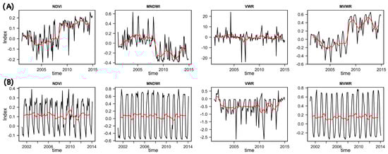 The time series of four remotely sensed indices, Normalized Difference Vegetation Index (NDVI), Modified Normalized Water Index (MNDWI), Vegetation-Water Ratio (VWR), and Modified Vegetation-Water Ratio (MVWR) used as the variables in (A) Dorge Sangi study site, and (B) Arpi study site. The red line indicates the trend obtained using a moving average with a window size of 3 time steps.