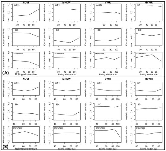 The first-difference detrending method resulted in the strongest trends, as expressed by Kendall’s τ at a rolling window size of around 50% of the time series, for most indices. This rolling window should not be either too short, as that can lead to noisy time series, or too long, as that smoothes the fluctuations that may be indicative of a critical transition. The sensitivity analysis on the trends in the leading indicators show that autocorrelation of MVWR and MNDWI is less sensitive to the rolling window size than the other indices (Figure 5). The positive Kendall’s τ for MVWR obtained from all indicators (around 0.9 for both the skewness and autocorrelation, and around 0.5 for the standard deviation) suggests that the leading indicators based on this spectral index correlated the strongest with the observed critical transition in the wetland, compared to NDVI, VWR, and MNDWI. In Arpi, all the indices showed less sensitivity to the sizes of the rolling window, except VWR that showed sensitivity for the Skewness.