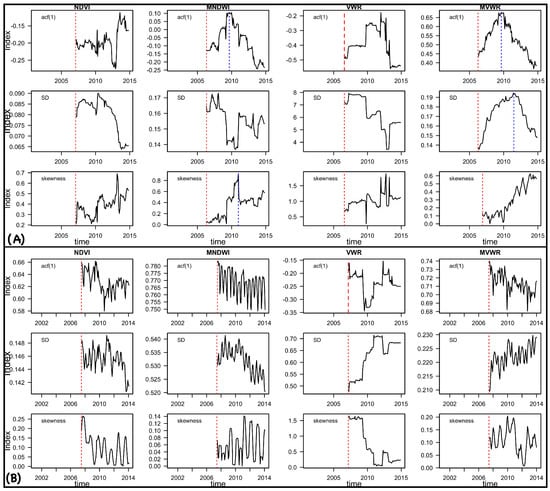 Metric-based leading indicators based on NDVI, MNDWI, VWR, and MVWR for Dorge Sangi (A), and Arpi (B) wetlands. The first, second, and third rows show autocorrelation at lag 1 (acf), standard deviation (SD), and skewness of each spectral indices, respectively; the red dotted lines mark the width of the rolling window used to detrend the data; the blue dotted lines mark the moment the trend changes abruptly which could be indicative of a tipping point.
