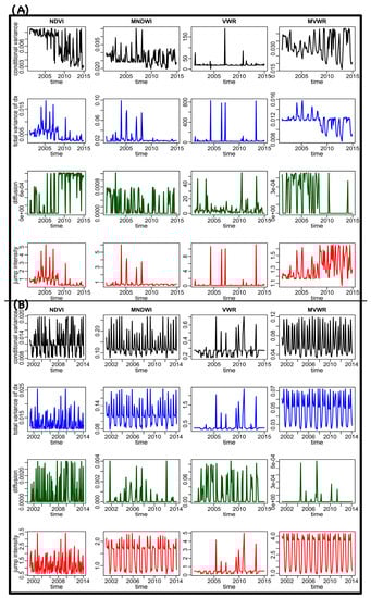 Nonparametric drift diffusion jump model of the monitored spectral indices NDVI, MNDWI, VWR, and MVWR versus time in the study sites Dorge Sangi (A), and Arpi (B).