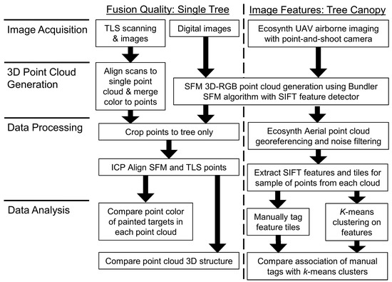 Workflow diagram describing the data collection, processing, and analysis used for evaluating SFM 3D-RGB point cloud fusion quality and image feature characteristics. Acronyms: TLS, terrestrial laser scanner; UAV, unmanned aerial vehicle; SFM, structure from motion; SIFT, scale invariant feature transform; ICP, iterative closest point. Ecosynth refers to techniques described in [2,3].