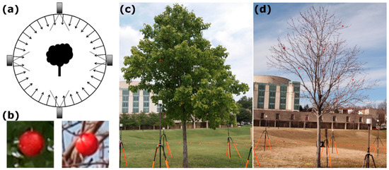 Single tree data collection configuration with TLS locations indicated by gray boxes and SFM image locations represented by arrows (a), painted red foam balls in the tree under leaf-on and leaf-off conditions (b), view of the tree with painted targets from approximately the same point of view under leaf-on (c) and leaf-off (d) conditions.