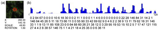 A single ‘image feature tile’ with a circle indicating the scale of the SIFT feature (a), and the 128-D SIFT image feature descriptor as a histogram and numerical vector (b).